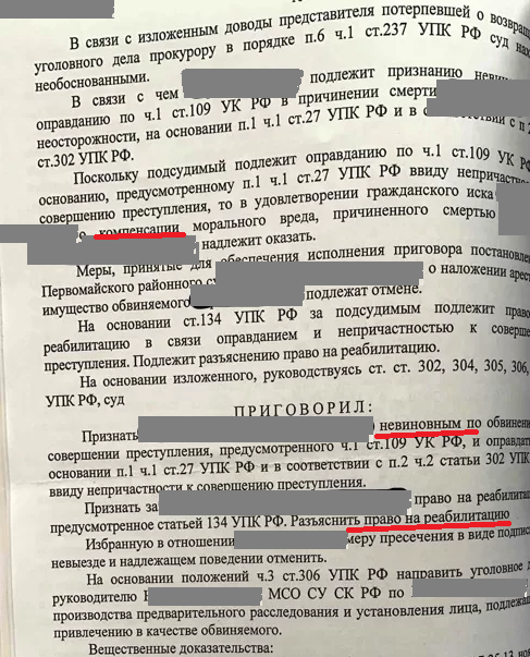 Гражданин N обвинялся по ч. 4 ст. 111 УК РФ. Мнение обвинения: гражданин N в стычке с другом, нанёс удары. Пострадавший доставлен на скорой в больницу, где умер. Обвиняемый вину не признал. По его словам, с приятелем была драка, они «валялись» по земле, сцепившись, 10 минут. Разнял дерущихся брат убитого. После этого они разошлись, более убитого гражданин N не видел. Ударов не наносил. Указал, что на него оказывается давление следствием. Благодаря работе адвоката по 111 УК, который задавал вопросы медицинским экспертам, работал со свидетелями, выяснено, что гражданин N не наносил убитому ударов, повлёкших вред (тяжкий). Его действия укладываются в ст. 116 УК, возбуждение дела невозможно, так как требуется заявление пострадавшего. Суд, согласно ст. 302 УПК РФ, гражданина N оправдал.